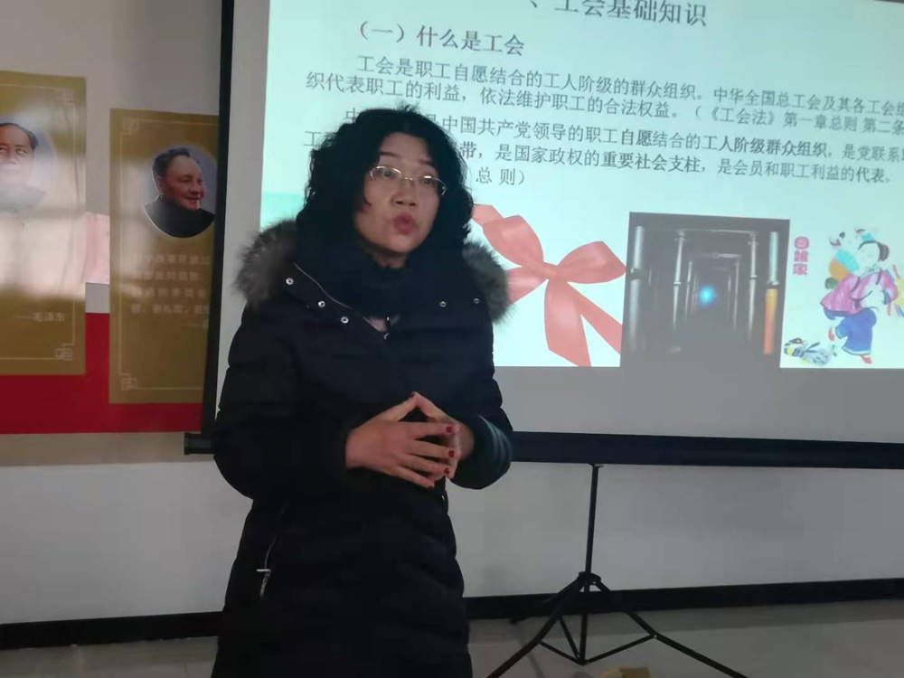 西安市职工大学胡娟教授生动形象的介绍工会的发展历程及成立工会的重要意义和作用。她强调中国工会是构建和谐劳动关系,是维护和协调企业家与职工之间的调和剂,使职工有归属感增加企业凝聚认知。
